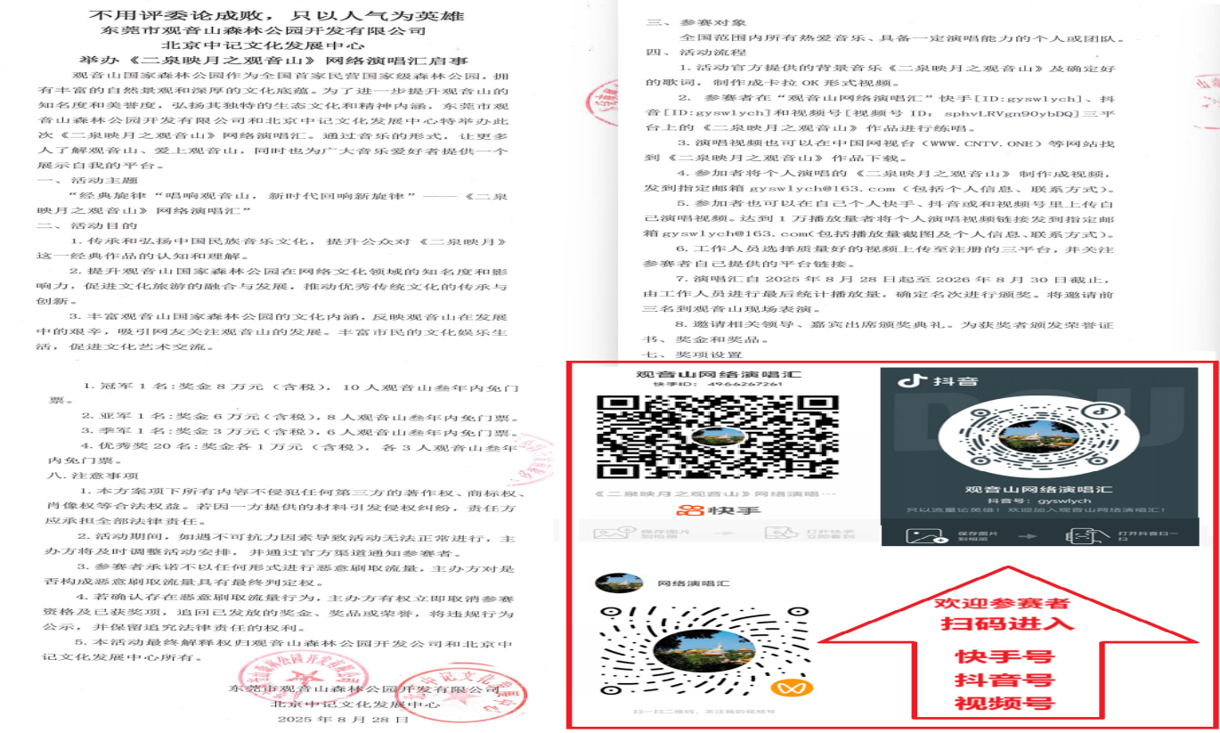 不用评委论成败,只以人气为英雄 东莞市观音山森林公园开发有限公司 北京中记文化发展中心 举办《二泉映月之观音山》网络演唱汇启事  观音山国家森林公园作为全国首家民营国家级森林公园,拥有丰富的自然景观和深厚的文化底蕴。为了进一步提升观音山的知名度和美誉度,弘扬其独特的生态文化和精神内涵,东莞市观音山森林公园开发有限公司和北京中记文化发展中心特举办此次《二泉映月之观音山》网络演唱汇。通过音乐的形式,让更多人了解观音山、爱上观音山,同时也为广大音乐爱好者提供一个展示自我的平台。 一、活动主题 “经典旋律“唱响观音山,新时代回响新旋律”——《二泉映月之观音山》网络演唱汇” 二、活动目的 1.传承和弘扬中国民族音乐文化,提升公众对《二泉映月》这一经典作品的认知和理解。 2.提升观音山国家森林公园在网络文化领域的知名度和影响力,促进文化旅游的融合与发展,推动优秀传统文化的传承与创新。 3.丰富观音山国家森林公园的文化内涵,反映观音山在发展中的艰辛,吸引网友关注观音山的发展。丰富市民的文化娱乐生活,促进文化艺术交流。 三、参赛对象 全国范围内所有热爱音乐、具备一定演唱能力的个人或团队。 四、活动流程 1.活动官方提供的背景音乐《二泉映月之观音山》及确定好的歌词,制作成卡拉OK形式视频。 2. 参赛者在“观音山网络演唱汇”快手[ID:gyswlych]、抖音[ID:gyswlych]和视频号[视频号ID:sphvLRVgn90ybDQ]三平台上的《二泉映月之观音山》作品进行练唱。 3.演唱视频也可以在中国网视台(WWW.CNTV.ONE)等网站找到《二泉映月之观音山》作品下载。 4.参加者将个人演唱的《二泉映月之观音山》制作成视频,发到指定邮箱gyswlych@163.com(包括个人信息、联系方式)。 5.参加者也可以在自己个人快手、抖音或和视频号里上传自己演唱视频。达到1万播放量者将个人演唱视频链接发到指定邮箱gyswlych@163.com(包括播放量截图及个人信息、联系方式)。 6.工作人员选择质量好的视频上传至注册的三平台,并关注参赛者自己提供的平台链接。 7.演唱汇自2025年8月28日起至2026年8月30日截止,由工作人员进行最后统计播放量,确定名次进行颁奖。将邀请前三名到观音山现场表演。 8.邀请相关领导、嘉宾出席颁奖典礼。为获奖者颁发荣誉证书、奖金和奖品。 五、奖项设置 1.冠军1名:奖金8万元(含税),10人观音山叁年内免门票。 2.亚军1名:奖金6万元(含税),8人观音山叁年内免门票。 3.季军1名:奖金3万元(含税),6人观音山叁年内免门票。 4.优秀奖20名:奖金各1万元(含税),各3人观音山叁年内免门票。 六.注意事项 1.本方案项下所有内容不侵犯任何第三方的著作权、商标权、肖像权等合法权益。若因一方提供的材料引发侵权纠纷,责任方应承担全部法律责任。 2.活动期间,如遇不可抗力因素导致活动无法正常进行,主办方将及时调整活动安排,并通过官方渠道通知参赛者。 3.参赛者承诺不以任何形式进行恶意刷取流量,主办方对是否构成恶意刷取流量具有最终判定权。 4.若确认存在恶意刷取流量行为,主办方有权立即取消参赛资格及已获奖项,追回已发放的奖金、奖品或荣誉,将违规行为公示,并保留追究法律责任的权利。 5.本活动最终解释权归观音山森林公园开发公司和北京中记文化发展中心所有。 东莞市观音山森林公园开发有限公司 北京中记文化发展中心 2025年8月28日