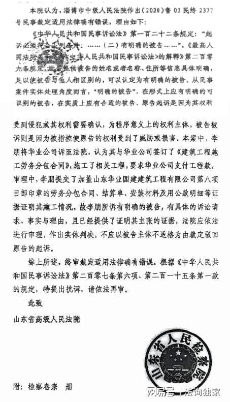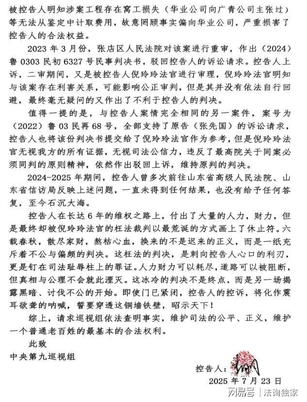 同案不同判,包工头向巡视组控诉淄博中院法官枉法裁判 独立撰稿人 李海波 同案不同判是指案情相似的案件因法律适用标准或裁判尺度不统一而导致不同判决结果的司法现象,其根源涉及法律体系、自由裁量权、案例指导制度等多重因素。同案不同判一般是在不同法院有相似案件存在不同判决。然而撰稿人发现同一个项目相似的合同纠纷在同一个法院,且都被省检察院抗诉的情况下竟然出现完全不一样的判决,这种匪夷所思的事情,就发生在淄博市中级法院! 近日,山东滨州市的李朋向法讯君投诉称他遭遇了淄博中院典型的“同案不同判”,淄博市中级人民法院此举严重破坏了法律适用的统一性和司法公信力。 李朋在7月23日,向中央巡视组控告了山东省淄博市中级人民法院民三庭庭长倪玲玲,请求追究在民事案件中办关系案的违法违纪行为。 承包劳务合同被欠薪 起诉却被驳回 2019年6月,李朋起诉华业公司劳务合同纠纷,2019年12月31日,淄博市张店区法院下达[(2019)鲁0303民初4016号之一]民事裁定书审查认为:原告提交的《建设工程施工劳务分包合同》中没有被告盖章确认,原告提交的结算单、淄博广青机器人邻舍安装材料及用工款项明细只有案外人范明峰或李继森的签字,没有被告的盖章,依据合同相对性原则,被告主体不适格,原告所诉应予以驳回。据此,依照《中华人民共和国民事诉讼法》第一百一十九条、第一百五十四条第一款第三项,《最高人民法院关于适用《中华人民共和国民事诉讼法》的解释》第二百零八条第三款之规定,裁定:驳回原告李朋的起诉。 那么华业公司和范明峰是什么关系?在中国经营报2021年1月9日《淄博一市重大项目疑陷“套路建”当地人士称多家公司受害》的报道里有这么一段话:“2017年4月,广青公司与山东华业国建建筑工程有限公司(以下简称“华业国建”)签订了《广青机器人生产车间、办公楼施工协议书》,广青公司代表杨光营和华业国建时任项目经理范明峰分别签字加盖公司公章。”也就是说项目合同有华业公司的公章,证明范明峰是华业公司的项目经理! 省检抗诉一审判决胜诉 二审再遭驳回 李朋不服淄博中院的这份终审判决,于是向检察机关申请监督。 山东省人民检察院认为淄博市中级人民法院作出(2020)鲁03民终2377号民事裁定适用法律确有错误,山东省人民检察院在2022年6月26日向山东省高级人民法院提起抗诉,山东省高级人民法院作出(2022)鲁民再285号民事裁定书,裁定撤销(2020)鲁03民终2377号和(2019)鲁0303民初4016号之一民事裁定,指令淄博市张店区人民法院审理本案。 2023年3月6日,李朋再次就该案进行立案,张店区人民法院作出(2023)鲁0303民初2433号判决书,判决:1.被告山东华业国建工程有限公司于本判决生效后十日内向原告李朋支付人工费 378372元;2.被告山东华业国建工程有限公司于本判决生效后十日内向原告李朋支付安装材料款9957元;3.被告山东华业国建工程有限公司于本判决生效后十日内向原告李朋支付安装材料款利息损失(以388329元为基数,从2018年6月18日起到2019年8月19日止,按照中国人民银行同期贷款基准利率计算的利息17497元;从 2019年8月20日起至到2023年4月20日止,按照同期中国人民银行授权全国银行间同业拆借中心公布的一年期贷款市场报价利率计算的利息54458元;自2023年4月21日起至实际付清之日止,按照同期中国人民银行授权全国银行间同业拆借中心公布的一年期贷款市场报价利率计算的利息。 2023年3月份,张店区人民法院对该案进行重审,作出(2024)鲁0303民初6327号民事判决书,认为:本院认为,根据双方合同约定,李朋承包的水电安装为包工包料,李朋应当向华业公司递交结算资料,由华业公司进行核实办理决算手续后支付工程款。本案中,李朋承包的水电工程未能全部施工完毕,但是也应当据实递交施工资料作为结算的依据。而李朋提交的“结算单”、“工资表”中仅记载为欠人工费 575 172元,与其原审、二审庭审中关于该人工费包括工程主楼的材料款、人工费及误工费的主张不一致,本次重审中李朋又表示只主张2017年12月31 日之前的人工费、该时段的人工费就是 575172元,李朋的表述前后矛盾。并且按照合同约定“由于发包人原因造成停工、窝工时应按实际发生情况向承办人赔偿损失。停工、窝工应办理书面洽商,方作为决算依据。”在双方未进行审计以及缺乏工程施工签证单等基础施工资料的情况下,无法依据范明峰出具的人工费“结算单”以及有范明峰和李继森签字的工资表作为确认支付工程费用的依据。其次,即使只主张人工费,其计算首先应当依据合同约定,合同没有约定的应当按照实际情况选择合适的计算办法,计费要考虑人工定额、人工工日单价、劳动力市场供求等因素,同时,人工费在工程量中的记取还要考虑施工队伍的资质等级等因素,等级不同人工费的记取结果也不同。本案中,李朋未提交其他能够确定人工费的证据,人工费无法计算。综上,李朋的诉讼请求证据不足,本院无法支持。依照《中华人民共和国民事诉讼法》第六十七条的规定,判决如下:驳回原告李朋的诉讼请求。 同公司同案情 判决截然不同 令李朋不服的是,与控告人案情完全相同的另一案件,淄博市中院下达的(2022)鲁03民再68号民事判决书:1.撤销本院(2020)鲁03民终1733号民事判决和淄博市张店区人民法院(2019)鲁0303民