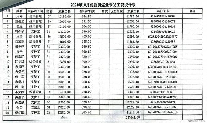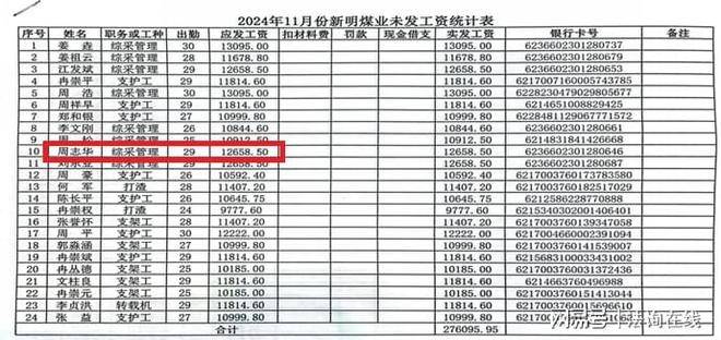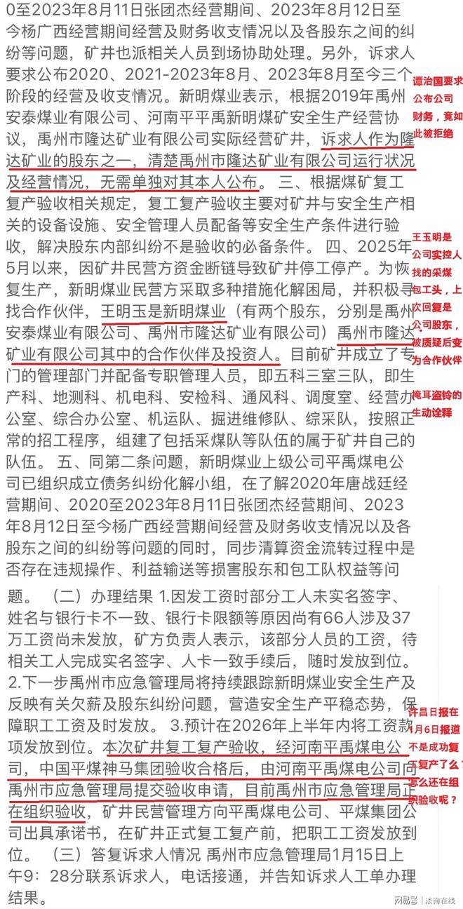 要过年了,河南平禹新明煤业那些农民工能拿到血汗钱过年吗 马上有钱!是国人们马年的最大愿望。都到腊月二十了,不少打工者已经回到了家乡,家家户户都在等待着过新年。但在河南平禹新明煤业公司,四川巴中的谭治国和几个工人还在苦苦等待着他们的血汗钱。 平禹新明煤业拖欠农民工工资在网上闹得沸沸扬扬,公司承诺的在2025年底之前发放也没有兑现。 之后撰稿人通过豫事办投诉到禹州市田会卿市长,在撰稿人指出是代农民工投诉后再次回复却依然说是不欠撰稿人工资,只有6个人30多万元没有发。并且说明:矿井民营方资金准备充足!而对于其他的20多名人员则是说非矿井人员,涉嫌工资造假,矿井已报警。 真是只有6个人工资没有发放吗?没有发放的几个人真是银行卡存在问题吗?在禹州市应急局领导给煤矿股东谭治国电话时,谭治国对此质问:“为什么发了几年的工资,银行卡都没有问题,现在怎么有问题了呢?” 真是存在工人冒领工资问题吗?报警了警方怎么调查处理的?目前还没有听说有农民工因此被处理,这是怎么回事呢? 图为周志华的安全帽和柜子。 看看,20多名重庆籍的农民工代表周志华没有拿到工资,他经过了矿方的培训,有工牌有柜子,在煤矿均有上班但怎么在调度里查不到呢?而周志华透露他们在井下培训时就是走过场而已:人、自救器、定位仪应该是一致的,当时有人在培训而有人在上班,所以培训5人就有2个人用的自救器、定位仪是别人的。同时,平禹新明煤业公司在培训考试时都是把答案写好了才发给培训人员。 1月11日,谭治国通过豫事办向禹州市田会卿市长提交了《关于平禹新明煤业公司复工复产验收的情况反映》,信里提出了5个诉求。之后禹州市应急局干部电话谭治国,而谭治国对其回复的五个问题都提出了自己的相应理由,但豫事办回复仍旧为应急局干部的单方面答复,丝毫不理谭治国的反映。谭治国在评论为极不满意后再次调查后回复依旧如前,只是将新来的采煤包工头王玉明的股东身份改为:合作伙伴。 谭治国提供的未发工资表显示的2023年10月-2025年5月未发工资和其垫付的资金为755多万元。 谭治国提供的平禹新明煤业2024年-2025年5月未发工资统计表 2024年10月工资表,有出勤天数应发工资和银行卡号。总共15页,计359人,其中有周志华应发工资12658.5元。 2024年11月未发工资表,其中有周志华应发工资12658.5元。 平禹新明煤业公司在1月24日的对账单显示,煤矿经营矿井仅支付了4589多万元,还下欠约700万元。既然民营方资金充足,为何不予以支付呢? 看看1月6日的《许昌日报》第二版“要闻”的公告吧,里面的公告显示拖欠的工人工资1173万元在2025年11月30日已全额发放。如果是这样,为什么那么多工人还多次到河南省信访局讨要工资呢?如此不负责任的公告,许昌日报审核了吗?再者,对于该版报道的《河南平禹新明煤业有限公司顺利通过复工复产验收 吹响2026年安全高效发展冲锋号》,谭治国表示是虚假新闻,将在春节后向河南省委宣传部举报。 1月26日,平禹新明煤业的农民工再次到河南省信访局讨要工资。 目前,谭治国和另外二个工人都还在禹州市等待了,希望能拿到一部分工钱,这样才能回到四川巴中的家,过年。 其实,煤矿将煤炭开采承包给谭治国,约定支付其开采资金每吨330元,工人工资等费用均由谭治国工队负责,只要矿方及时结算支付开采资金,就不会存在拖欠农民工工资之说,当然更没有冒领工资之说:因为这些,都应该由谭治国等人负责处理! 所以,解决新明煤业公司的农民工工资问题很简单,把应该支付给谭治国工队的开采资金解决了就可以!毕竟。你们也说了:目前民营方资金充足! 马年啊,马上有钱!衷心希望在新明煤业公司的那些川渝农民工能早日拿到自己应得的血汗钱,高高兴兴地过年!(撰稿人 李海波) |