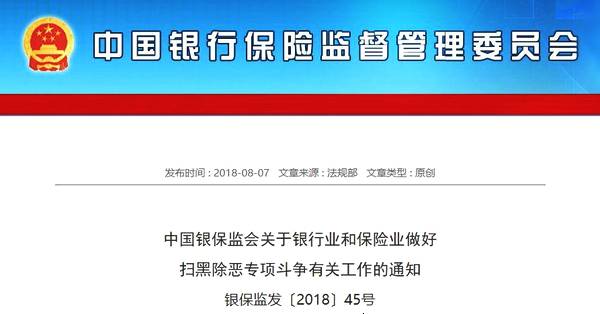 近日,银监局、保监局、银行、保险公司等金融机构收到中国银保监会的最新通知。通知要求,坚决贯彻落实中共中央、国务院《关于开展扫黑除恶专项斗争的通知》要求,旗帜鲜明地开展扫黑除恶专项斗争。