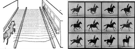 马在奔跑的时候是否有一瞬间四蹄同时离地呢?单凭人眼是难以分辨的。电影之父埃德沃德·迈布里奇通过计算,设计一套由多架相机组成的天才感应装置,马奔跑过程中依次踢断连接在不同相机上的绳子同时触发相机快门,就可以拍摄到一组马匹运动姿态。为纪念这一伟大的时刻,迈布里奇在拍摄奔马时所用的细线就被称为“迈布里奇线”。