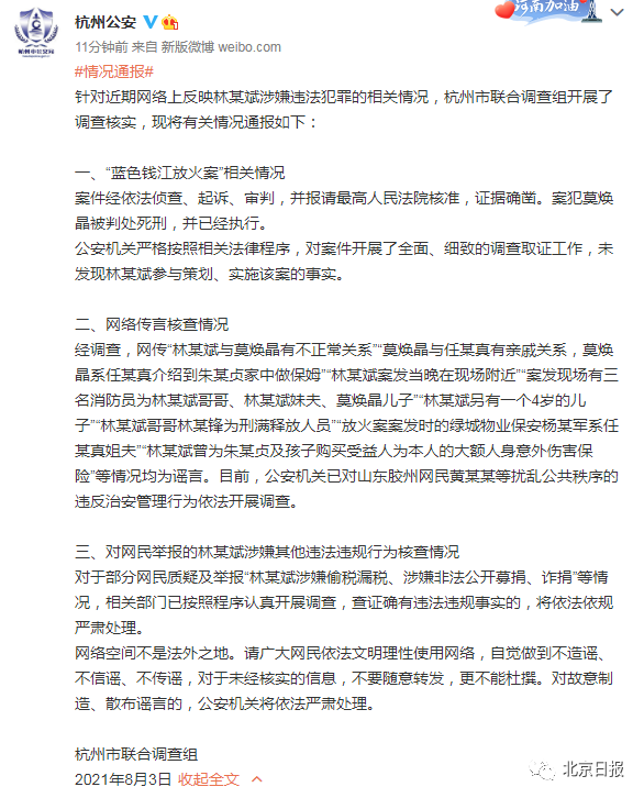 据@杭州公安 8月3日通报,针对近期网络上反映林某斌涉嫌违法犯罪的相关情况,杭州市联合调查组开展了调查核实,有关情况如下: 一、“蓝色钱江放火案”相关情况 案件经依法侦查、起诉、审判,并报请最高人民法院核准,证据确凿。案犯莫焕晶被判处死刑,并已经执行。公安机关严格按照相关法律程序,对案件开展了全面、细致的调查取证工作,未发现林某斌参与策划、实施该案的事实。 二、网络传言核查情况 经调查,网传“林某斌与莫焕晶有不正常关系” “莫焕晶与任某真有亲戚关系,莫焕晶系任某真介绍到朱某贞家中做保姆” “林某斌案发当晚在现场附近” “案发现场有三名消防员为林某斌哥哥、林某斌妹夫、莫焕晶儿子” “林某斌另有一个4岁的儿子” “林某斌哥哥林某锋为刑满释放人员” “放火案案发时的绿城物业保安杨某军系任某真姐夫” “林某斌曾为朱某贞及孩子购买受益人为本人的大额人身意外伤害保险”等情况均为谣言。 目前,公安机关已对山东胶州网民黄某某等扰乱公共秩序的违反治安管理行为依法开展调查。 三、对网民举报的林某斌涉嫌其他违法违规行为核查情况 对于部分网民质疑及举报“林某斌涉嫌偷税漏税、涉嫌非法公开募捐、诈捐”等情况,相关部门已按照程序认真开展调查,查证确有违法违规事实的,将依法依规严肃处理。 网络空间不是法外之地。请广大网民依法文明理性使用网络,自觉做到不造谣、不信谣、不传谣,对于未经核实的信息,不要随意转发,更不能杜撰。对故意制造、散布谣言的,公安机关将依法严肃处理。 杭州市联合调查组 2021年8月3日 (以上来源:杭州公安) 简而言之,经警方调查后,除了“偷税漏税”、“非法公开募捐、诈捐”仍待查证外,网络上对林生斌的大部分指控,几乎是无中生有。 据媒体报道,此前的6月30日,林生斌通过社交平台,向网友们宣布自己已重新组建家庭并新得一女的好消息。 他表示,这几年在大家的关心和鼓励之下,自己渐渐走出了那段灰暗的日子,并开始了新的生活,新的伴侣是个可以包容并给予自己安全感的女孩,同时,他们也有了共同的爱情结晶。 然而,随之而来的并非是网友们的祝福,而是铺天盖地的质疑声,不少网友还曝出了一些所谓的“黑料”,林生斌遭到全网扒皮。 除此次警方通报中明确提到的几则谣言外,此前,网上还有不少说法,比如:林生斌的现任是小三;林生斌曾经对妻子家暴;林生斌做法事镇压妻儿魂魄,等。 7月8日,饱受舆论压力的林生斌一连发了5条动态,对传闻进行了一一否认。 但网友仍不买账,网络上依旧是一片声讨。 如今警方正式发布调查通报,不仅为林生斌正名,还表示会对故意制造、散布谣言的人,依法严肃处理。 自此,一场轰轰烈烈的闹剧,似乎迎来了它的大结局。事情的反转,也确实出乎不少人的意料。 当然,我们还是要相信官方的说法。毕竟,相对于大多数人的道听途说、片面解读,官方调查肯定更全面深入,更客观公正,因而也更权威可信。 (综合自网络,如有侵权,请联系删除) |
