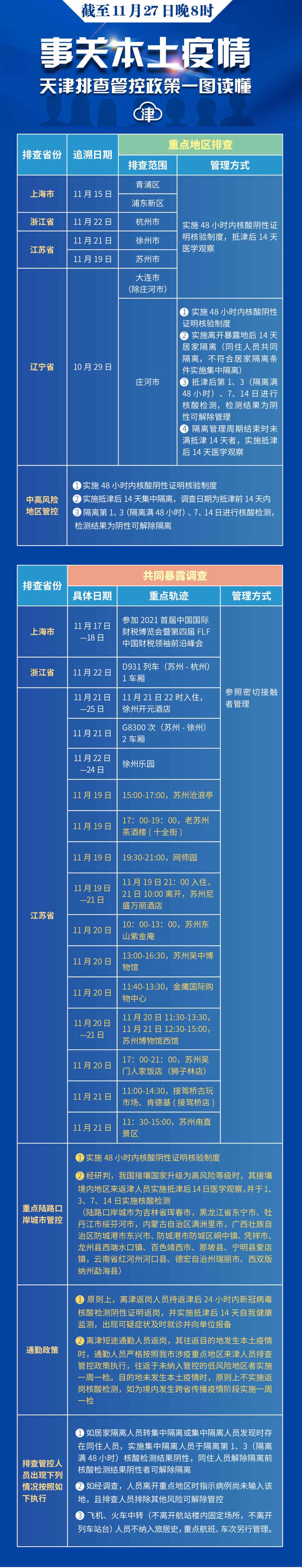 原标题:分享 离津返岗注意这个要求!天津最新排查管控范围(截至11.27晚8时) 来源:天津理工大学 记者11月27日从天津市疫情防控指挥部获悉,目前疫情形势日益严峻复杂,为科学精准、严防疫情反弹,天津市疫情防控指挥部再次更新近期区域排查管控范围,涉及到的相关人员主动向社区、工作单位等报备。 一、经过流行病学调查后,涉及下述流行病学史:11月19日15:00-17:00途经江苏省苏州市沧浪亭,17:00-19:00途经老苏州茶酒楼(十全街),19:30-21:00途经网师园,11月19日21:00至21日10:00途经苏州尼盛万丽酒店,11月20日10:00-13:00途经苏州东山紫金庵,11月20日13:00-16:30途经苏州吴中博物馆,11月20日11:40-13:30途经金鹰国际购物中心,11月20日11:30-13:30及11月21日12:30-15:00途经苏州博物馆西馆,11月20日17:00-21:00途经苏州吴门人家饭店(狮子林店),11月21日11:00-14:30途经接驾桥古玩市场、肯德基(接驾桥店),11月21日11:30-15:00途经苏州甪直景区,为感染者轨迹重合人员,参照密切接触者管理,集中隔离管理周期结束时未满抵津14天者,继续实施居家医学观察至抵津后14天,第14天核酸检测结果为阴性可解除管理。 二、重点陆路口岸城市管控:经研判,对我国重点陆路口岸城市来返津人员实施抵津后14日医学观察,并于1、3、7、14日实施核酸检测。现阶段重点陆路口岸城市包括吉林省珲春市,黑龙江省东宁市、牡丹江市绥芬河市,内蒙古自治区满洲里市,广西壮族自治区防城港市东兴市、防城港市防城区峒中镇、凭祥市、龙州县西端水口镇、百色靖西市、那坡县、宁明县爱店镇,云南省红河州河口县、德宏自治州瑞丽市、西双版纳州勐海县。集中隔离管理周期结束时未满抵津14天者,继续实施居家医学观察至抵津后14天,第14天核酸检测结果为阴性可解除管理。 三、离津返岗通勤政策:原则上,离津返岗人员持返津后24小时内新冠病毒核酸检测阴性证明返岗,并实施抵津后14天自我健康监测,出现可疑症状及时就诊并向单位报备。离津短途通勤人员返岗,其往返目的地发生本土疫情时,通勤人员严格按照我市涉疫重点地区来津人员排查管控政策执行,往返于未纳入管控的低风险地区者实施一周一检。目的地未发生本土疫情时,原则上不实施返岗核酸检测,如为境内发生跨省传播疫情阶段实施一周一检。