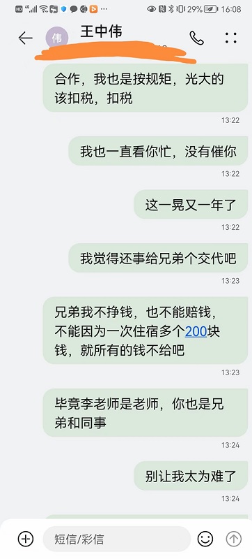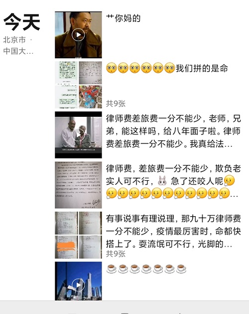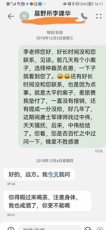 28日下午,忍无可忍的北京知名律师王远方在朋友圈发出催款信息,直指太平保险有限公司北京分公司和北京律所拖欠其差旅费和律师费近8年,多次讨要未果。 王远方律师所发的朋友圈 催款函 太平财产保险有限公司北京分公司刘宝新、宋悦经理: 北京晨野律师事务所李建华主任、王中伟律师: 北京晨野律师事务所受太平保险有限公司委托,北京晨野律师事务所指派,就太平保险诉讼案件,我本人和唐士军律师在全国各地代理几十起案件,我们不辞辛苦,风餐露宿,东到东北鸡西,南到贵州金织,西到内蒙古克什克腾旗。将近八年律师费一分不给,我们自己垫付差旅费也一分不给,我们这期间索要律师费、差旅费多达几十次,太平公司不给报销的理由是我们曾经在河北石家庄住宿一晚上200元左右超标,以此理由,一分钱费用不给报销,期间也多次和老师李建华沟通,但也没下文,期间也多次和晨野沟通,总是以太平保险公司没有给付为理由拖欠律师费、差旅费。一直因为师生关系,兄弟情义没有到法院提起诉讼,2021年即将过去,瘟疫即将过去,我也希望我们的心病也过去。 王远方律师 2021年12月28日 2018年联系晨野律师事务所主任李建华,回复当天过问。 也多次联系晨野律师事务所王中伟律师,却不予答复。 王远方代理的太平保险公司案件很多 |