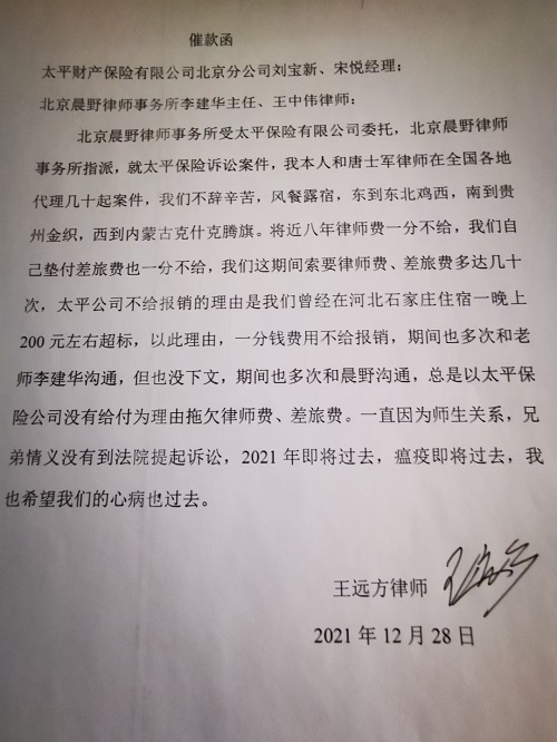 太平保险拖欠差旅费律师费近8年,律师被逼公开催款