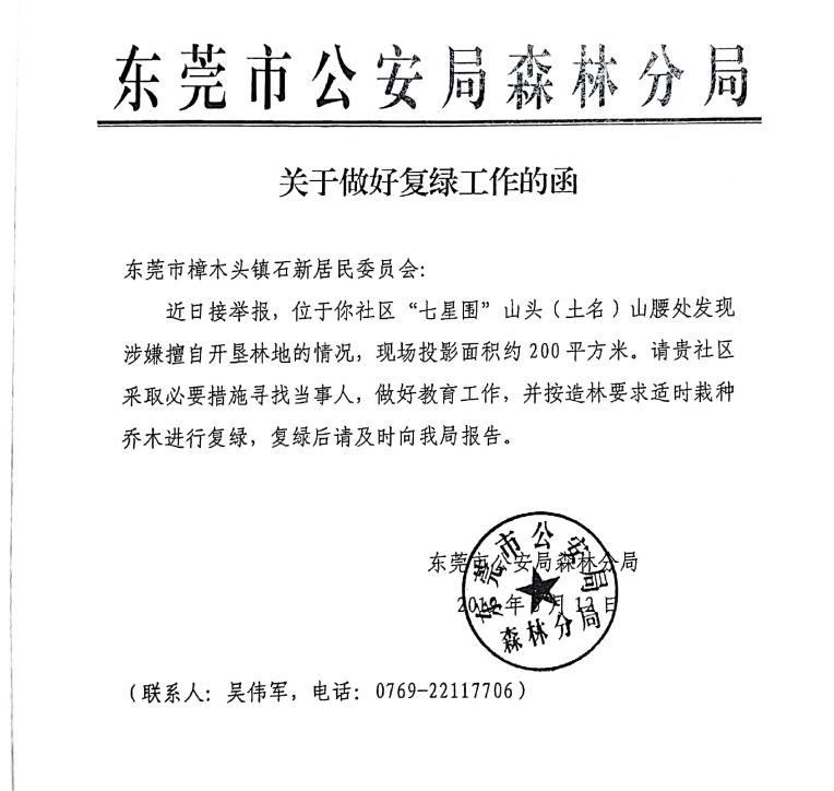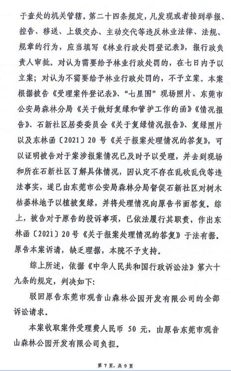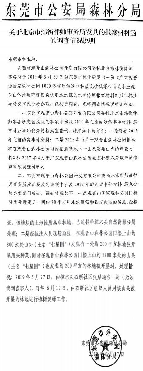观音山公园2020年11月20日向东莞市林业局报案,请求东莞市林业局依法查处的违法行为不单单包括自2003 年至2020年11月20日报案之时观音山公园里1000多亩原始次生林被毁的毁林行为,还包括毁林后的开荒、种蔬菜、种植果树、建房的违法行为。 根据2012年2月13日全国人大法工委工办发[2012]20号《对关有关问题的意见》精神,这些毁林开垦、毁林种蔬菜、毁林种植果树、毁林建房的违法行为,具有继续状态,应当自纠正违法行为之日起计算行政处罚的追诉时效。即使如原审两级法院判决所认定的,东莞市林业局对2019年及之前的违法行为进行过查处和答复,但是,因为对2019年及之前的这些违法行为没有依法查处,致使至2020年11月20日公园报案时,违法开荒、种蔬菜、种果树、建房的违法行为仍然继续存在和发生。根据《中华人民共和国行政处罚法》第三十六条的规定,对观音山公园2020年11月20日报案所举报事项中的2019年及之前发生而连续或者继续到2020年11月20日的毁林开荒、毁林种植蔬菜、毁林种植果树、毁林建房的违法行为,在公园方2020年11月20日报案后,东莞市林业局应当再次进行调查处理。 两处林地被毁用来开荒的违法事实证据确凿 两级法院枉顾事实 原审两级法院判决认定,对申请人举报的“2020 年11月19日发现观音山公司‘七星围’山头出现150平方米左右的林地树木被砍、草木丛干死,变成荒地”的情况,东莞市林业局已履行法定职责,证据不足。(详见原一审判决第7页第一段、二审判决第11页第二段) 一审判决第7页 二审判决第11页 原审两级法院对其合法性、关联性、真实性已经认可的在案证据《关于北京市炜衡律师事务所发具的报案材料函的调查情况说明》、《关于做好复绿工作的函》、《关于复绿工作的情况报告》、《受理案件登记表》证明,东莞市林业局已经自认发现有两处林地被毁用来开荒的森林违法事实的存在。 东莞市公安局森林分局在2019年6月27日出具给东莞市林业局的《关于北京市炜衡律师事务所发具的报案材料函的调查情况说明》显示,经执法人员现场勘验,在观音山森林公园门楼上山约800米处山头(土名“七星围”)发现有一处约 200平方米林地被开垦用来种菜,同时在观音山森林公园门楼上山约1200米处的山头(土名“七星围”)也发现约200平方米的林地被开垦过。 东莞市公安局森林分局2019年5月12日发给石新居委会的《关于做好复绿工作的函》显示,森林分局要求石新社区“采取必要措施寻找当事人,做好教育工作,并按造林要求适时栽种乔木进行复绿”。