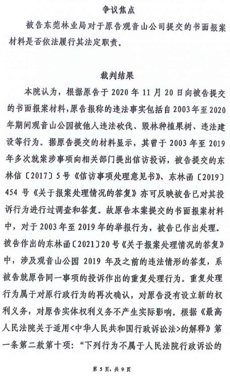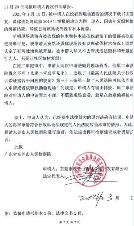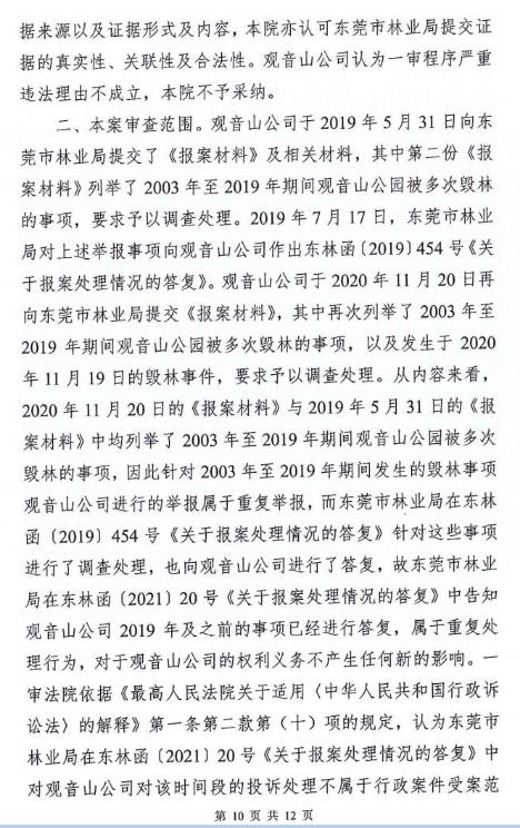 《东莞市优化营商环境条例》施行,观音山却无奈向检察院申请监督独立撰稿人 李海波 2月22日,东莞市人大常委会召开《东莞市优化营商环境条例》颁布实施新闻发布会。3月,《东莞市优化营商环境条例》正式施行,且制定了多项措施。但位于樟木头镇的东莞名企观音山公园却认为,他们并没有感到这些政策法规给民营企业带来实在的好处,企业发展严重受限。 东莞市优化营商环境 让企业家卸下思想包袱 据报道,3月20日,由东莞市发展和改革局、东莞世界莞商联合会联合主办的“政策赋能·助企远航”莞商学院第四期政策分享会举行。活动邀请暨南大学法学院副院长、知识产权研究院院长郭宗杰对《东莞市优化营商环境条例》进行深度解读,助力莞商莞企实现高质量发展。 为打破民营企业在市场竞争中存在的各种各样的“卷帘门”,为广大民营企业家送上“雪中炭”,东莞制定了《东莞市12345政务服务便民热线管理办法》,建起营商环境专线,让企业乘上诉求化解“直通车”。除此之外,全面优化法治营商环境8条措施、法治“硬措施”18条、“为企服务26条”“营造四个环境23项”等措施齐发,聚焦知识产权综合保护、涉企合规改革、依法平等保护民营企业合法权益和涉外法律服务方面。 报道里提到:东莞刀刃向内,全面准确落实司法责任制,打造“一站式”诉讼服务和健全完善多元解纷机制,推动政法改革更加系统集成、协同高效,为民营企业健康发展释放新活力。营商环境的成色,扎扎实实体现在“少跑腿”甚至“不跑腿”的办事效率上。随着智慧法院、数字检察加速建设,科技与司法执法走向深度融合。 媒体认为东莞市“法治雨露润万企”,将涉企法治工作经验制度化、规范化(推进法治化营商环境建设,东莞走在驰而不息的路上),让司法执法有温度、有力度(不止于立法。东莞正从执法、司法等环节全面发力);企业吃上“定心丸”、注入“强心剂”。以法治之力护航,东莞现已形成独到经验。 报道里还采用华南农业大学公共管理学院副教授郑浩生的话:“法治化营商环境犹如‘城市的铠甲’,作为一座充满活力和创新精神的城市,东莞太需要这身‘铠甲’来保护城市经济和各类企业。”。东莞对营商环境的重视可见一斑。 报道里说,东莞市的一切目的都是让企业家卸下思想包袱,轻装前进,而诸多措施主要是依法平等保护民营企业合法权益。东莞市的这些政策看似该市特别重视营商环境,竭力为企业发展服务。 东莞名企观音山公园没得到法治护航 发展不畅 报道还说:法治护航,是民企发展“硬核底气”。观音山董事长黄淦波却苦涩了,19个问题,引起国内各级媒体大量报道,引起多位知名法学专家点评呼吁,却没有得到法治保护,观音山的发展受到了严重制约! 实际上,在当地民企观音山森林公园看来就是作秀, 为何作为知名企业家的观音山董事长黄淦波一直背着包袱艰难前行呢?就在三月初,观音山还就东莞市第一法院三法官向各级部门举报(多家网站以《东莞市第一法院法官朱珍珍、王海建、易菲菲涉嫌枉法裁判被实名举报为题报道》)。 3月26日,东莞市第一市区检察院已经受理了该监督申请。 除此之外,观音山近日还向东莞市人民检察院提起《监督申请书》:申请人东莞市观音山森林公园开发有限公司因与被申请人东莞市林业局不履行法定职责案, 不服东莞市第一人民法院(2021)粤1971行初1384号行政判决和东莞市中级人民法院(2022)粤19行终580号行政判决,向广东省高级人民法院申请再审,广东省高级人民法院于2023年11月29日作出(2023)粤行申982号行政裁定,驳回了申请人的再审申请,申请人认为原一审、二审判决确有错误,根据《人民检察院行政诉讼监督规则》第十九条第一款第一项的规定,向东莞市人民检察院申请监督:请求东莞市人民检察院向东莞市中级人民法院提出再审检察建议,或者提请广东省人民检察院抗诉,要求法院再审判决撤销东莞市第一人民法院(2021) 粵1971 行初1384号行政判决和东莞市中级人民法院(2022)粵19行终580号行政判决,判令被申请人依法履行职责。 两级法院判决认定东莞市林业局对观音山公园被多次毁林的举报事项进行了调查处理 原审两级法院判决认定东莞市林业局针对2003年至2019年期间观音山公园被多次毁林的举报事项进行了调查处理,也向观音山公园进行了答复,证据不足。(详见原一审判决第 5页倒数第一段、二审判决第10页第二段) 一审判决第 5页 二审判决第10页 原审两级法院判决认定东莞市林业局针对观音山公园2003年至2019年期间毁林的举报事项已经进行过调查处理和答复申请人的主要证据,是东林信[2017]5号《信访事项处理意见书》和东林函[2019]454号《关于报案处理情况的答复》。 东林函[2019]454号《关于报案处理情况的答复》内容有:被申请人答复申请人在材料中提及的2015年及之前关于观音山公园1000多亩原始次生林被乱砍乱伐的情况,被申请人已于2017年2月在《信访事项处理意见书》(东林信[2017]5 号)中答复申请人;被申请人还答复了材料中提及关于2019年4月期间毁林和违建情况调查处理的情况。观音山公园认为,东林信[2017]5号《信访事项处理意见书》,不能证明东莞市林业局对公园提出的信访事项进行了调查处理并向公园进行了答复。没有在案证据证明东莞市林业局将该《信访事项处理意见书》向公园
