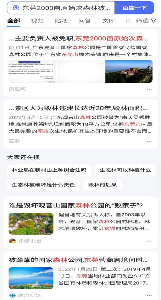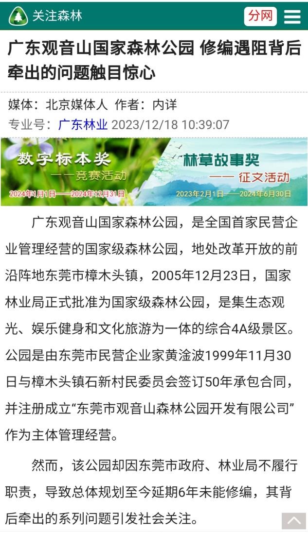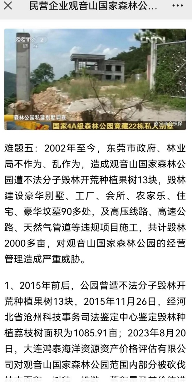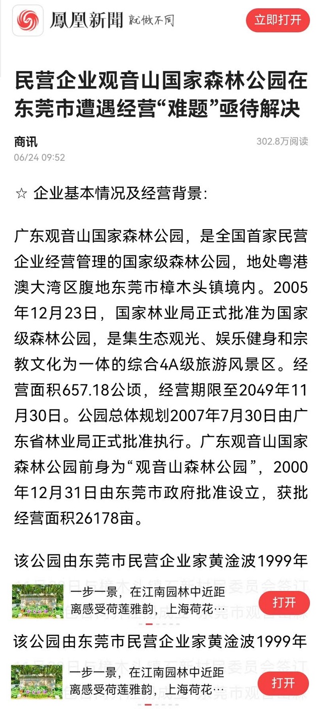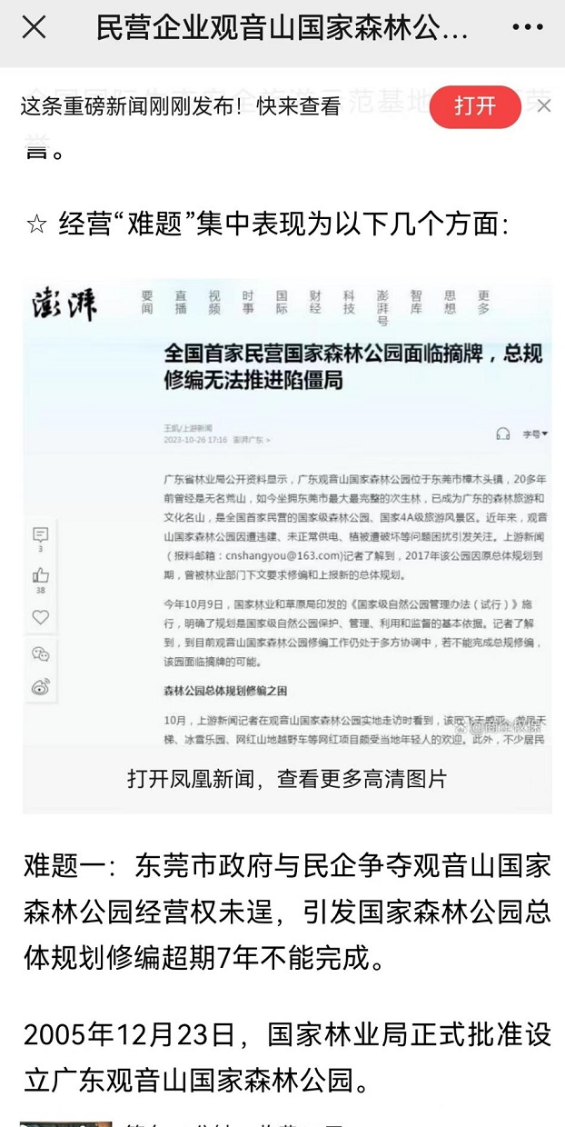 而观音山公园大量的森林被毁,长期被电老虎压制而80%服务区域没有市政供电,公园内大量的违法别墅和豪华山坟屹立不倒,观音山公园《总规》修编从2018年起至今没有解决等等,均是发生在肖市长、肖书记在东莞主持工作期间,期间数百家媒体的连番报道,居然至今无动于衷,这种不作为、乱作为的表率作用,可以很好的对应了东莞长期被人们诟病的“东莞门”及“观音山事件”。 凤凰网等主流媒体近日刊发了一则报道,单个媒体阅读量突破300万人次。