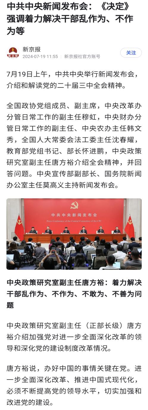 纵观该报道,对于解读三中全会精神提出的“着力解决干部乱作为、不作为、不敢为、不善为问题”只字未提。 7月19日上午,中共中央举行新闻发布会,介绍和解读党的二十届三中全会精神。中共中央新闻发布会上,解读《决定》强调着力解决干部乱作为、不作为等,以此增强党组织政治功能和组织功能。 东莞市委、市政府的学习贯彻三中全会精神,故意不提此重点问题,不知道是有意在回避什么问题?撰稿人知道的是,在观音山国家森林公园多年来遭遇到的种种打压,是存在市委、市政府及林业局、供电局等部门干部大量的不作为及乱作为的情况。 ![]() 国家林草局网站一直关注观音山国家森林公园编修问题。 ![]() 对于观音山供电问题,国内上百家网站多次予以了关注,南方电网及供电局至今仍不予解决。 比如说市政府及市林业局对观音山2000亩林地被毁视而不见,大量的豪华别墅和豪华山坟在公园随处可见也视而不见。以及观音山国家森林公园编修拖延不处理等问题,还有供电局对公园申请供电卡脖子25年了还是无视。国内专家、媒体多年的呼吁当耳边风。对此等乱作为现象,东莞市委市政府也是不置可否,市委书记肖亚非及市长吕成蹊更是漠视公园的呼声不予调研解决,谁能不说东莞市的部分主要干部是不作为干部或者是乱作为呢? ![]() 东莞2000亩原始次森林被毁,网上热搜一大片,就是没人管。这可是犯罪呀! 一个不作为、不敢为的领导干部,其组织政治功能和组织功能令人怀疑是否胜任。还在会上对学习宣传贯彻工作进行动员部署、推动落实。居庙堂之高,满口紧跟党中央,实际是口是心非,不思民之疾苦!要尔等何用?! 成天会上叫的震天响,媒体上宣传得天花乱坠。这样就能获得民众的好感吗?我看未必!真心地落实一下党中央的政策,领会一下《决定》的实质精神,踏踏实实做事,不香吗?如此,才会真正的得民心,顺民意! 只有真正为老百姓办实事,哪怕是一件能感动人民的小事,人民都会真心实意地表达自己的敬意__因为中国人民是最朴实无华的,最懂得感恩的人民! ![]() 会上中央政策研究室副主任(正部长级)唐方裕介绍加强党对进一步全面深化改革的领导和深化党的建设制度改革情况。 唐方裕说,办好中国的事情关键在党。进一步全面深化改革、推进中国式现代化,必须不断提高党的领导水平,切实加强和改进党的建设。 正是基于党的领导和党的建设的极端重要性,全会《决定》在总结经验、阐述意义、提出原则、部署举措中,都把党的领导和党的建设作为重要内容。《决定》强调,必须深刻领悟“两个确立”的决定性意义,增强“四个意识”、坚定“四个自信”、做到“两个维护”,保持以党的自我革命引领社会革命的高度自觉,确保党始终成为中国特色社会主义事业的坚强领导核心。同时强调,要聚焦提高党的领导水平和长期执政能力,创新和改进领导方式和执政方式,深化党的建设制度改革,健全全面从严治党体系。 一是坚持党中央对进一步全面深化改革的集中统一领导。《决定》强调党中央领导改革的总体设计、统筹协调、整体推进,鼓励各地区各部门结合实际开拓创新,创造可复制、可推广的新鲜经验。提出要走好新时代党的群众路线,把社会期盼、群众智慧、专家意见、基层经验充分吸收到改革设计中来。提出要围绕解决突出矛盾设置改革议题,优化重点改革方案生成机制,及时发现问题、纠正偏差。 二是深化党的建设制度改革,《决定》强调以调动全党抓改革、促发展的积极性、主动性、创造性为着力点,加强党的创新理论武装,深化干部人事制度改革,鲜明树立选人用人正确导向,全面提高干部现代化建设能力,树立和践行正确政绩观,着力解决干部乱作为、不作为、不敢为、不善为问题。强调要落实“三个区分开来”,激励干部开拓进取、干事创业。提出增强党组织政治功能和组织功能,探索加强新经济组织、新社会组织、新就业群体党的建设有效途径,完善党员教育管理、作用发挥机制。 三是深入推进党风廉政建设和反腐败斗争。《决定》强调健全政治监督具体化、精准化、常态化机制,锲而不舍落实中央八项规定精神,坚决反对形式主义、官僚主义,切实为基层减负。强调深化运用监督执纪“四种形态”,综合发挥党的纪律的教育约束、保障激励作用,完善一体推进不敢腐、不能腐、不想腐工作机制,着力铲除腐败滋生的土壤和条件。强调完善党和国家监督体系,强化全面从严治党主体责任和监督责任。强调加强诬告行为治理,等等。 《决定》的上述部署,充分体现了持之以恒推进全面从严治党的坚定和清醒。 而反观东莞市政府二十年前就开始明目张胆的抢夺民企的财产和经营权,且不是刘志庚一人为之,而是在他的率领下动用了东莞几乎所有的党政力量,伴随着此违法目的的是无所不用其极的乱作为。什么监听监视,什么公安、司法下场进行暴力抢夺,甚至不惜杀人放火,各职能部门长年大量的违法违规的乱作为,巴不得当天就把观音山公园抢夺到手,好进奉给市委书记刘志庚。 而网上有大量相关的报道,虽然有些被别有用心的人删了,但读者关注度越来越多。 网上资料显示,肖亚非2018年任东莞市长,2021年5月,升任东莞市委书记。
