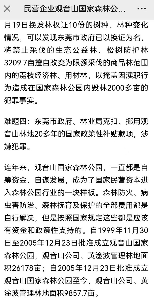 此文章对多年来造成观音山公园困境的原因、现状以及由哪个部门造成的,及十大解决办法均写得明明白白,如果肖书记们还装着不知道,那就表现得太过于出格了吧。 观音山公园二十五年艰难的发展历程很好的佐证了二十届三中全会决定关于必须尽快解决营商环境的正确性。希望在肖书记的主持下,观音山公园的苦日子能尽快结束,迎来光明的明天,也让广大的读者们看到东莞的光明。 |