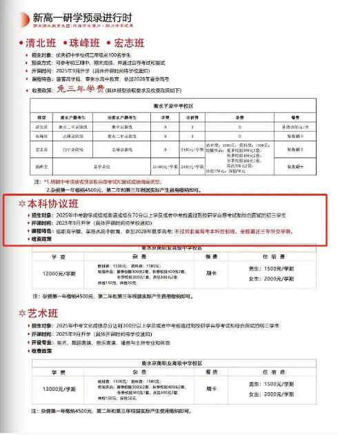 河北衡水多所学校可签“保本”协议?家长、学校、当地部门等多方回应 海报新闻记者 孙佃潇 报道 “2020年的时候,我家孩子在衡水滨湖新区博文中等职业学校上学,当时学校一次性收取了3年学费,还跟我们签了‘保本’协议,承诺孩子如果达不到本科分数线,就退还全部学费。”近日,河北一名学生家长张先生向海报新闻记者反映,其孩子于2023年毕业时没有考上本科,但该校并未按协议承诺退还学费。 连日来,海报新闻记者针对相关情况,咨询了多名参与当地招生工作的相关人员,发现当地学校与学生签署“保本”协议的情况并非个例。 家长:学校一次性收3年学费、签“保本”协议 “当时去学校报名的时候,学校建议我们一次性交清3年学费,说这样就省了一笔钱。”张先生告诉记者,孩子于2020年在衡水滨湖新区博文中等职业学校入学时,向该校一次性缴纳了3年学费,共计3万余元。 张先生孩子于2020年在衡水滨湖新区博文中等职业学校入学时,向该校一次性缴纳了3年学费(图为受访者提供) “按照国家规定,是不允许学校一次性收取3年学费的。”记者在张先生提供的学校“缴费须知”单中看到,除了住宿费、书本费、杂费等费用外,张先生孩子需要缴纳的学费为15000元/年,并注明一次性交清3年学费需32000元。 此外,张先生还提供了包含其孩子在内的多名学生与该校签署的《衡水滨湖新区博文中等职业学校美术升学协议书》,签署日期为2020年9月30日。在这份协议书中,校方承诺,学生进入该校2020级美术特长班学习,校方保证学生高考时文化课、美术课达到本科分数线,如果达不到本科分数线,将退还学生高中3年全部学费。 多名学生与衡水滨湖新区博文中等职业学校签署的“保本”协议(图为受访者提供) “我家孩子2023年毕业时没有考上本科,但是学校没有退还学费。学校给出的解释是,这份协议是跟学校上一任老板签的,跟现任老板没有关系。”对此,张先生感到无法理解,他认为这是学生与校方签署的协议,并非与个体签署,因此学校有义务履行该承诺。 记者从企查查平台查询获悉,与上述“保本”协议甲方名称一致的衡水滨湖新区博文中等职业学校成立于2020年5月,位于衡水市滨湖新区,社会组织类型为民办非企业单位,业务范围为全日制中等职业教育。2022年3月,该校法定代表人蔡文君变更为鲁长杰。目前,该校已注销。 衡水博文中等职业学校官网截图 据衡水博文中等职业学校(以下简称“衡水博文”)官网介绍,该校于2022年9月迁入衡水市高新技术产业开发区新校区。企查查平台显示,衡水博文成立于2023年11月,其法定代表人同为鲁长杰。 “2022年至2024年,衡水博文也跟学生签了‘保本’协议。”据张先生了解,尽管该校已变更名称并搬入新校区,但仍存在一次性收取3年学费、签“保本”协议的行为。 近日,针对张先生反映的问题,海报新闻记者致电衡水博文综合办公室及招生办公室,其工作人员均称,该校并不存在一次性收取3年学费、签署“保本”协议的情况。 招生人员:当地有其他学校可签“保本”协议 衡水博文是否存在张先生反映的一系列问题?连日来,海报新闻记者针对相关情况,咨询了多名声称参与当地招生工作的人员。记者发现,学校与学生签署“保本”协议的情况在当地并非个例。 “去年我负责衡水博文(招生工作),没有一次性缴纳3年学费的政策,今年也没有(该政策)。”蒋先生告诉记者,其曾在衡水博文工作,现已离开原岗位,正在从事当地多所学校的招生工作。据他了解,衡水博文并不会与学生签署“保本”协议。 不过,另一名同样负责当地学校招生工作的贺先生则告诉记者:“博文之前有过‘保本’协议,现在可能改政策了。” 在更进一步的咨询中,记者得知,目前当地尚有其他学校会与学生签署“保本”协议。“衡水京衡职业高级中学(以下简称“衡水京衡”)现在正在签协议,可以保孩子在2028年高考的时候过本科录取分数线。”蒋先生说。 衡水京衡职业高级中学2025年招生简章显示,本科协议班明确注明“不过河北省高考本科控制线,全额退还三年所交学费”“衡水京衡不是按成绩跟孩子签协议,而是看孩子的学习态度。”蒋先生向记者介绍,学生在衡水京衡入学一个月后,学校会考核学生的表现,若符合要求,则会与其签署“保本”协议。“比如,孩子在课上有没有睡觉,如果没有,就会跟孩子签‘保本’协议,保孩子高考过本科录取分数线。如果不过分数线,3年学费全退。” 记者在蒋先生提供的衡水京衡2025年招生简章中看到,该校新高一面向全国招生,并细分为清北班、本科协议班、艺术班等。其中,本科协议班招生对象为2025年中考数学成绩或英语成绩在70分以上学员,或者中考前通过到校研学自荐考试和综合面试的初三学生。在其课程特色中,明确注明“不过河北省高考本科控制线,全额退还三年所交学费”。 至于上述本科协议班对学生的成绩要求,蒋先生告诉记者,若学生在今年中考前确定进入该校学习,录取标准则可放宽。“4月份能考300分的孩子就可以来参加面试,根据孩子面试情况,可以酌情减少相应成绩。其实就是看看孩子愿不愿意努力学习,愿意的话,分数低也能录取。” “4月13日会开课,进行初中冲刺,也会赠送高中预科。如果3年都在咱们这边上学,会给孩子签‘保本’协议。”衡水京衡招生办一工作人员也向记者证实了这一点