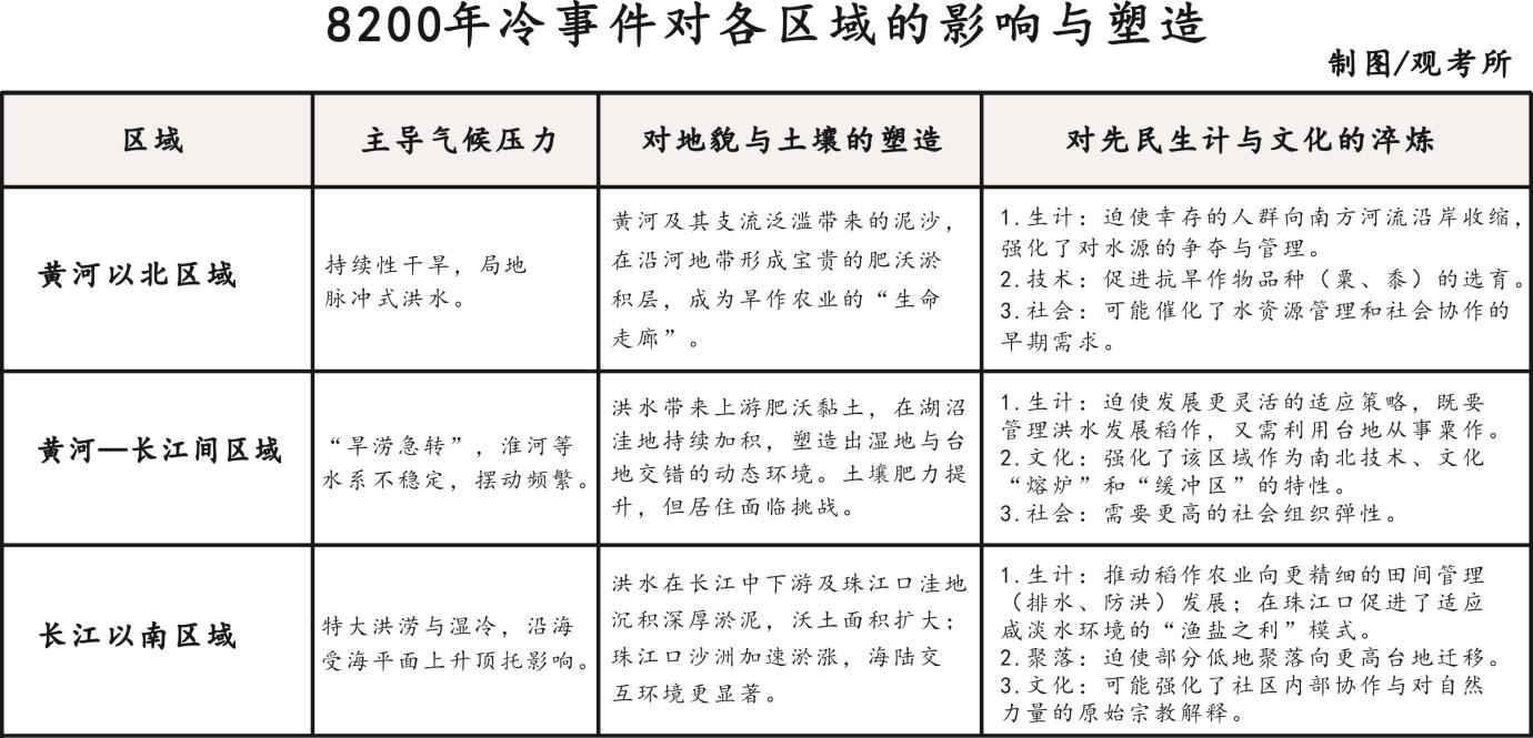 开篇:四张核心图表的启示——解码气候与文化演进的万年对话 在我们脚下这片孕育了人类文明、看似永恒的土地之下,其实埋藏着一部惊心动魄的万年史诗。这部史诗的篇章,由冰与火、水与土交替书写,主角是我们的祖先,导演则是反复无常的全球气候。 谁来揭示它?这可能吗?又有何种震撼人心的学术价值?一个全球性的文化谜题为我们提供了线索:据统计,全世界有超过600个民族的神话与传说中,都有关于大洪水的描述。其范围之广,跨越五大洲,这难道仅仅是巧合?还是远古人类对一段共同恐怖记忆的集体回响?真实情况究竟如何?是一场席卷全球的单一灾难,还是周期性上演的天地浩劫?时至今日,我们理应运用现代科学的力量,综合多学科的研究成果,对这一塑造了人类命运的现象进行系统性的解码。 您是否想过,在文字尚未诞生的蒙昧年代,我们的先祖是如何面对那足以抹平一切、持续数十年甚至数百年的万古寒荒般的严寒,以及随之而来的、吞噬家园的滔天大洪水?文明微弱的火种,又是如何在极端的冰封与滔天的洪流中得以保存,并最终燃成照亮东方的燎原之火?中华文明的坚韧幼苗,如何在万年前的冻土中萌发,一路栉风沐雨,长成参天巨树,并在全球古文明大多已中断的背景下硕果仅存,成为人类万年历史绵延至今的主要古老文明体之一。 能为这些疑问提供系统性答案的离不开这四张核心图表。 图一:12800年来全球气温变化示意图 图二:四次大降温事件年代参数及对中华文明演进的影响 图三:12800年来全球气温变化引发的洪水事件对应表 图四:中华文明万年间各黄金时期演进对照表 这四张图表绝非冰冷数据的简单罗列。它们是一个全新研究范式的呈现——“气候—文明互动分析框架”,该范式由东莞观音山考古研究所团队经过多年探索,在充分吸纳前人成果、去伪存真的基础上,创造性地融合古气候学、地质学、考古学、古天文学、分子人类学、语言学等多学科方法而提出。它清晰地揭示:中华文明的发展节奏,与全球气候的周期性剧变息息相关,文明的每一次重大进步,都深深烙刻着适应环境挑战的印记。 本文正是运用这一范式,首次尝试以“黄河以北”“黄河—长江之间”“长江以南”这三大具有鲜明生态与文化差异的地理舞台为叙事主线,带领读者重返那段波澜壮阔的岁月。我们将看到,从约12800年前“新仙女木事件”的毁灭性寒冬,再到约5500年前各大区域文明百花齐放的鼎盛时期,气候如何像一只无形巨手,塑造着中华大地的山河地貌,筛选着动植物种群,也锤炼着我们祖先的生存策略、社会组织与精神世界。这是一部关于生存、适应与创造的万年史诗,而“大考古观”下的“观音山新范式”,正是我们打开这部史诗之门的钥匙。 本文的核心在于重点讲述中华文明的发展历程,故世界其他地区的文明演进进程在此暂且不表。然而,本文所构建的“气候—文明互动”分析框架具有普适性。若能以此框架为工具,参照世界其他各地的考古证据,亦可勾勒出全球其他各大洲及各地理单元的基本概况。 本文在广义上使用“中华文明”一词,指代在中华大地上自万年前以来孕育、发展,并最终形成连续不断文化传统的整个进程,其早期阶段通常被称为“文化”或“复杂社会”。 第一部分:“四表”的学术价值与考古赋能 1.总述“四表”揭示的宏观规律与文明韧性 上述四张核心图表揭示了一个超越线性史观的宏观规律:中华文明的发展轨迹,并非一帆风顺的坦途,而是在“气候剧烈降温—冰川扩张大面积南下—气候急速回暖—冰川崩解消融—特大洪水席卷—冲积平原扩展—气候相对稳定—万物蓬勃生长—新一轮降温”的周期性震荡中,经历着毁灭性打击与奇迹般的重生。每一次全球性的环境剧变之后,往往迎来一段长达数百乃至数千年的相对稳定期,即“黄金时期”。文明的薪火就在这“毁灭(剧变)—重建(黄金期初期)—发展(黄金期鼎盛)”的循环中,一次次淬炼,一步步迈向更高阶的复杂社会。 我们将这种在极端环境压力下不仅能够存续、更能实现复苏与跃升的能力,定义为中华文明早期韧性的核心体现。而“四表”所构建的“气候—文明互动分析框架”,正是我们解码这份万年韧性的关键工具之一。 2.介绍四大黄金期的文化命名(甘棠安期、玉露和期、景风明期、嘉穗丰期)及其人文内涵 观音山考古研究所研究团队以众多学科考古成果为基础,创造性地从中华典籍中提炼出具有深厚文化内涵的命名体系——“甘棠安期”(约11500年—8200年前)、“玉露和期”(约7900年—5500年前)、“景风明期”(约5200年—4300年前)与“嘉穗丰期”(约3900年前—清代时期)。这套命名不仅根植于考古实证,更承载着对文明韧性的深刻理解,通过科学与人文交融的叙事框架,向世界展现中华文明在万年气候挑战中持续发展的独特智慧。 从这一宏大视角延伸开来,我们发现世界其他各大洲古人类的命运走向,与这四张图揭示的气候律动同样密不可分。不同的是,由于地理环境、资源禀赋和社会结构等多重复杂原因,其他大陆的古文明在严酷的气候挑战下都相继中断,未能将火种传递至今。唯有中华文明凭借其优越的地理环境和独特的适应智慧、坚韧的社会组织及强大的文化凝聚力,百折不挠,长盛不衰,在一次次劫难后焕发新的生机,发扬光大,最终成为人类文明史上最具代表