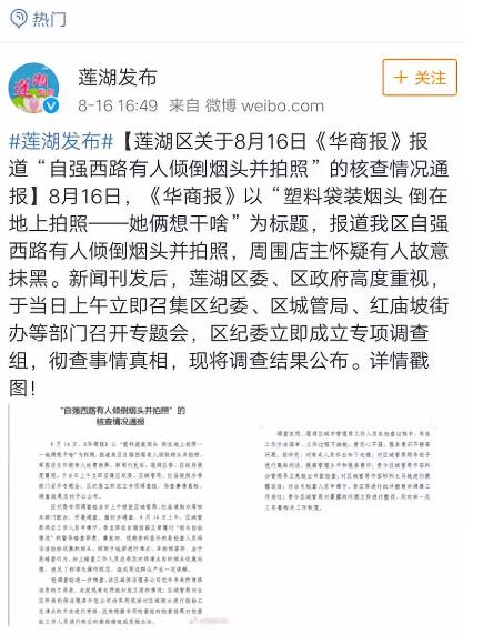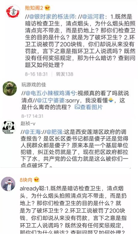 然而,这份通报不仅没有平息公众的愤怒,反而还进一步激化了事态——因为很多网民乃至不少网络名人,都觉得官方给出的那个“丢烟头是为了方便统计烟头数量”的解释,不仅有违常识,更与之前两名市容检查人员被曝光丢烟头的视频对不上。
