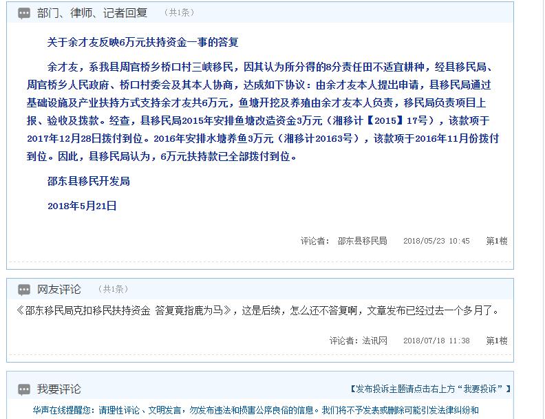 湖南邵东县移民局:不理村民诉求为哪般 撰稿人 李堂平 法讯网在5月20日发布了《湖南邵阳市邵东县移民局克扣移民改造资金》,之后在6月14日发布《邵东移民局克扣移民扶持资金:答复竟指鹿为马》,文章发布后均得到搜狐网、凤凰网、一点资讯等近百家网站转载,引起广大网民强烈反响。 会议记录和处理意见,均显示邵东县移民局要扶持余才友6万元 5月20日,法讯网发布《湖南邵阳市邵东县移民局克扣移民改造资金》,之后搜狐、凤凰网等几十家网站转发,引起强烈反响。邵东县移民局给撰稿人及在湖南日报、华声在线、《新湖南》主办的“投诉直通车”的答复是这样的: