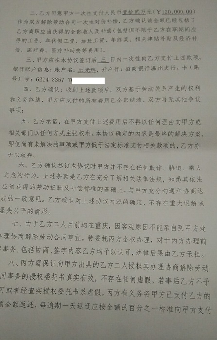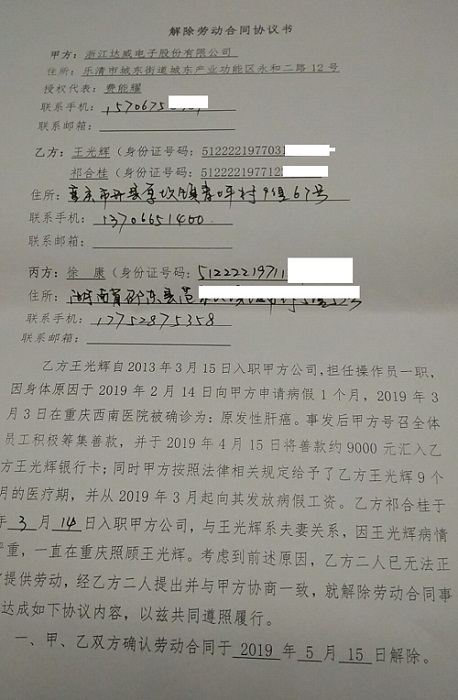 5月16日,患癌员工王光辉的姐夫赶赴浙江乐清,在乐清市城东街道人民调解委员会 主持调解下达成协议,王光辉与浙江达威电子股份有限公司解除合同,仅仅获得一次性对价补偿款12万元。