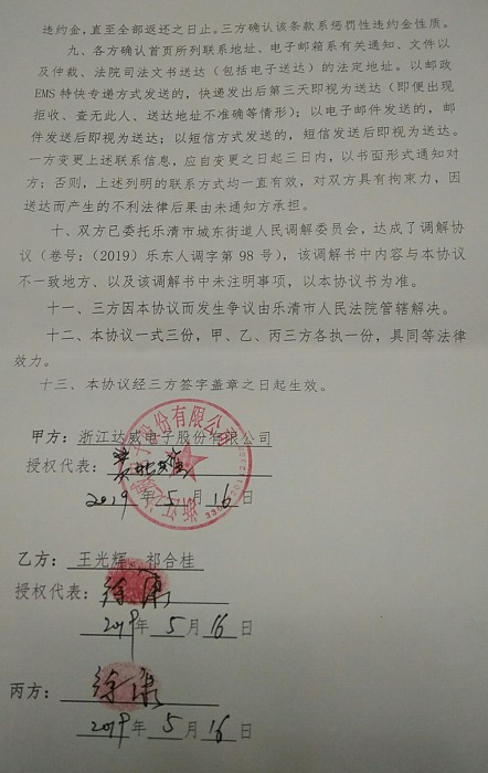 三、王光辉收到上述款项后,与浙江达威电子股份有限公司的所有事项全部结清,不得再次以任何理由向达威电子主张权利。