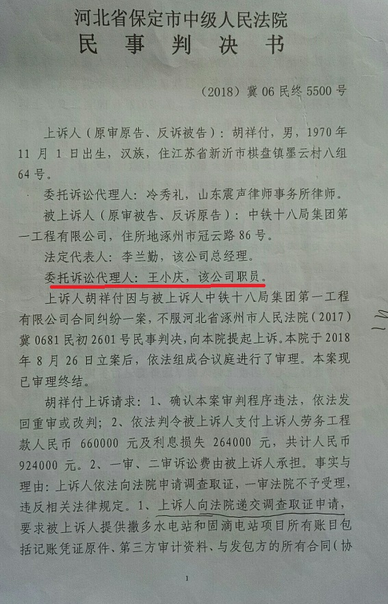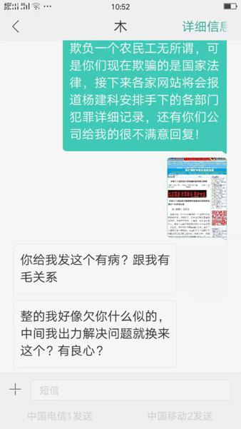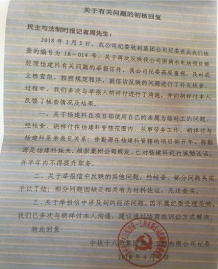 中铁十八局项目经理杨建科涉嫌多起违法火爆网络,百余领导无动于衷 独立撰稿人 李海波  6月28日,法讯网发布了《中铁十八局一公司项目经理杨建科被亲表兄举报》,搜狐、一点资讯、凤凰网等近百家网站予以转发,引起广大网友强烈反响。 7月11日,法讯君按照胡祥付提供的百余位中铁领导陆续发了短信,请求领导予以了解回复。之后胡祥付也给领导们发了短信。 这位中铁领导很不耐烦,不知道是什么职位 这位部长态度,我们只能呵呵 中铁需要这种领导多一点 7月14日的这律师函值得推敲,一是没有说文章链接,谁知道是哪个网页?二是说是诽谤,你倒说下哪里诽谤了?胡祥付举报事实清楚,图文并茂,你得具体阐述一下啊!三是这律师是中铁十八局一公司职员,怎么一转眼是律师了?四是7月14日的律师函,直到7月19日下午5:10才发出。个中原因只有当事人清楚,法讯君不便猜测。  鉴于此,法讯网没有理会该函件。 中铁十八局一公司给这位假记者(胡祥付向民主与法制社投诉其收了五万元的事情,社里答复没这人,但表示介绍信是真的)的回复也说明杨建科存在一些问题,但就是没有书面答复给胡祥付。 至此,曝光已经过去二个多月了,但中铁方面没有丝毫动静。 杨建科居然是文明家庭标兵。 杨建科只有唯一一家全家福,果真是因为忙吗?看看下面的这小老婆和儿子图片,也没有杨建科本人呢! 杨建科情人王诺(杨建科叫蛋妈)和儿子留影 他包养小老婆所生儿子都6岁了,项目部的人都清楚!将杨建科上报为文明家庭标兵,中铁十八局的职工们是否都是以他为标准而生活和工作的?! 胡祥付表示还将爆出更多中铁十八局第一公司的更多问题,并对真实性负一切法律责任。