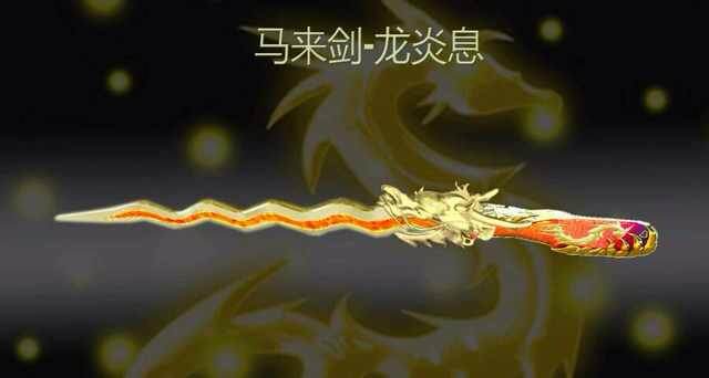 马来剑—炎龙息,刀身由纯金打造,自龙口中,流出龙息般的岩浆蔓延刀身,闪烁着炽热和杀气的光芒