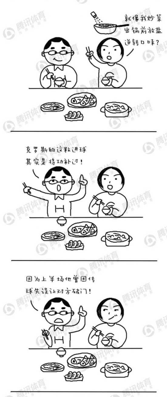 “就像我炒菜出锅前放盐逆转口味?”呃,老婆你的脑回路很清奇哦!我开始孜孜不倦地给老婆讲解:“克罗斯的这粒进球其实是将功补过,因为上半场他曾因传球失误让对方破门!”