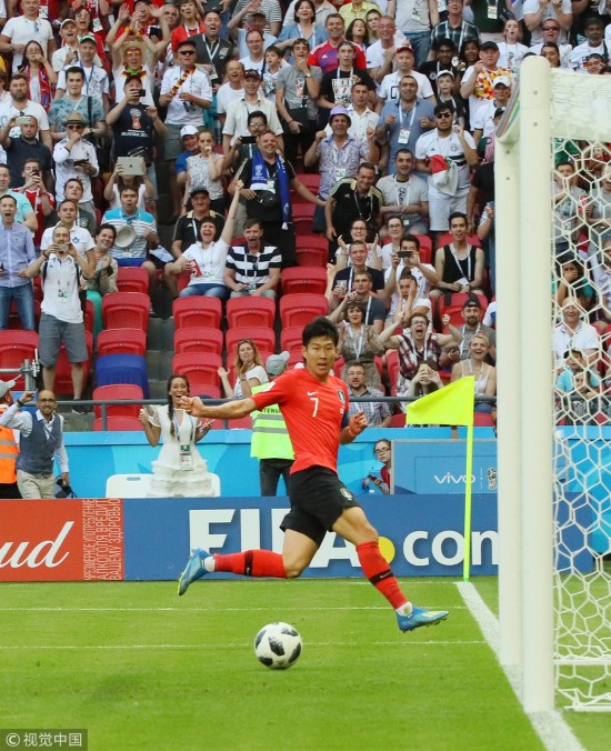 2018年6月27日,俄罗斯喀山,2018俄罗斯世界杯小组赛F组,韩国Vs德国。第96分钟,韩国队孙兴民反击射空门进球。