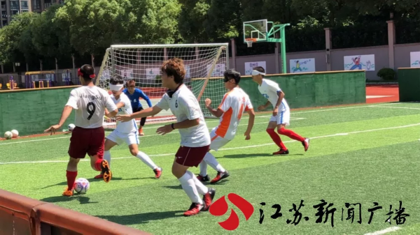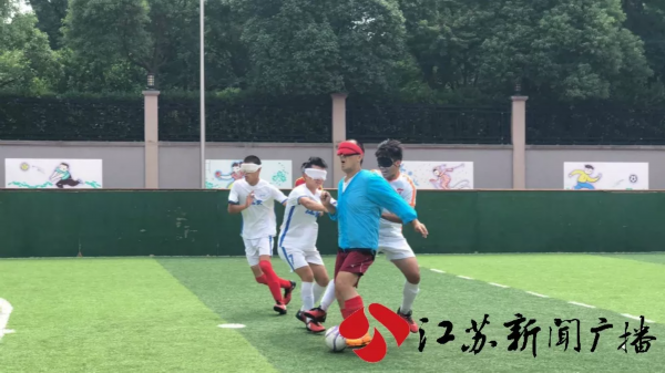 6月23日清晨,在南通特殊教育中心的足球场上,江苏盲人足球队的队员们正在踢一场训练赛,运动员们带着眼罩,一边不断发出声音向其他队员传递自己的方位,同时两腿不断盘带,把球往前踢,身手灵活,对抗程度丝毫不输常人。