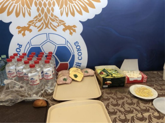 日本队这次的大本营,是当地足球豪门喀山红宝石的大本营所在地。它的媒体中心,直接占用的就是喀山红宝石俱乐部的媒体中心。去年联合会杯,C罗领衔的葡萄牙队在此训练期间,也是用的同一媒体中心,但说到媒体美食,葡萄牙队当时连一瓶水也没有为媒体提供,但这一次日本队的媒体美食服务,虽然数量不大,种类也有限,也算是比较用心的。