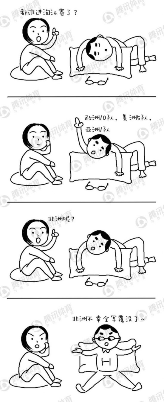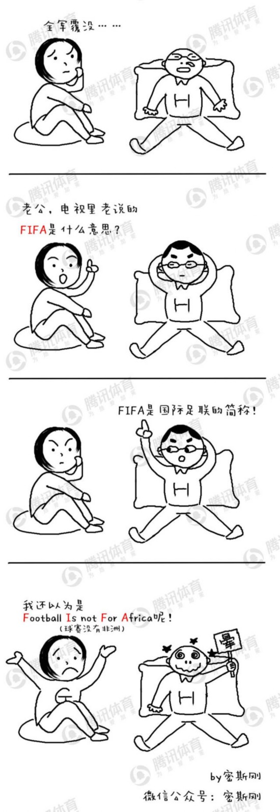 非洲全军覆没?老婆听后陷入了沉思......于是非常认真地问我:“电视里老说的FIFA是什么意思?”“FIFA就是国际足联的简称啊!”老婆听完摊手说到:“我还以为是football is not for afraca(球赛没有非洲)!”我听完后,晕倒在地......