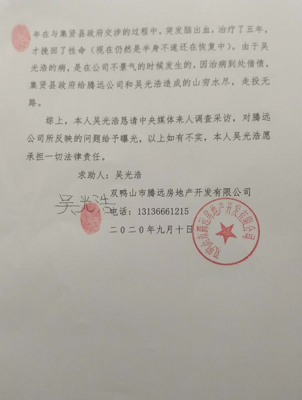 求 助 信 中央媒体: 我是黑龙江省双鸭山市腾远房地产开发有限公司(简称腾远公司)的法定代表人吴光浩。我实名举报黑龙江省双鸭山市集贤县人民政府滥用职权,乱作为、不作为、欺上瞒下的违法乱纪事实。由于集贤县政府的违法行为,致使腾远公司债台高筑,颇临破产的边源。举报事实如下: 一、2011年8月29日,集贤县政府与腾远公司就站前广场项目改造工程签订了合同书及补充合同书。 二、腾远公司按合同书约定开始办理站前小区建设相关手续时,发现集贤县政府福利屯站前广场及西侧棚户区改造工程涉及的18.5亩铁路用地使用权非集贤县政府所有。在 土地权属不清的情况下,集贤县政府竟以欺瞒的方式将腾远 公司招商中标引进,致使腾远公司不能按预期时间办理不动产权证书、建设用地规划许可证、建设工程规划许可证、建筑工程施工许可证、商品房预售许可证。 三、集贤县政府在腾远公司不具备动工开发所必需的基本条件下,强行违法乱纪要求腾远公司进行开发施工。 四、腾远公司因集贤县政府的欺瞒行为导致上述五证不能如期办理(足足推迟了6年时间),腾远公司不能如期预售房屋,致使腾远公司工程资金链断裂。无奈的情况下,腾远公司只能高利息贷款。 由于集贤县政府的违约行为,给腾远公司造成直接经济损失达6亿余元。 五、集贤县政府与腾远公司合同约定,为弥补腾远公司亏损,并获合理利润,集贤县政府为腾远公司提供建设商品房用地10万平方米,但集贤县政府只给腾远公司71314平方米土地,余下的28686平方米土地在腾远公司不知情的情况下,转卖给了他人。 六、集贤县政府的欺上瞒下、胡作为、乱作为、不作为的及其不负责的行径,使腾远公司损失惨重,举步维艰,难以度日,几近垮掉。 在此情况下,腾远公司法定代表人吴光浩多次、多年找到了历届县长,反映腾远公司的情况(2011年-2016年许德东任县长,2016至2018年李凯任县长,2019年至今郭伟任县长)。而集贤县政府一拖再拖,不予解决。由于集贤县政府不作为,腾远公司在2013年就损失1500万元,到2020年损失达6亿多元。每届县长都是给付一千多万元应付了事。三届县长共给付五千余万元。从签订合同到现在已经九年的时间了,腾远公司找集贤县政府,可政府的门都进不去。集贤县政府给腾远公司造成的损失,集贤县政府视而不见。 由于集贤县政府不作为,给腾远公司造成严重损失。腾远公司的法律代表人吴光浩急火攻心,焦虑成疾,于2015年在与集贤县政府交涉的过程中,突发脑出血,治疗了五年,才挽回了性命(现在仍然是半身不遂还在恢复中)。由于吴光浩的病,是在公司不景气的时候发生的,因治病到处借债,集贤县政府给腾远公司和吴光浩造成的山穷水尽,走投无路。 综上,本人吴光浩恳请中央媒体来人调查采访,对腾远公司所反映的问题给予曝光,以上如有不实,本人吴光浩愿承担一切法律责任。 求助人:吴光浩 双鸭山市腾远房地产开发有限公司 电话:13136661215 二0二0年九月十四日 |
