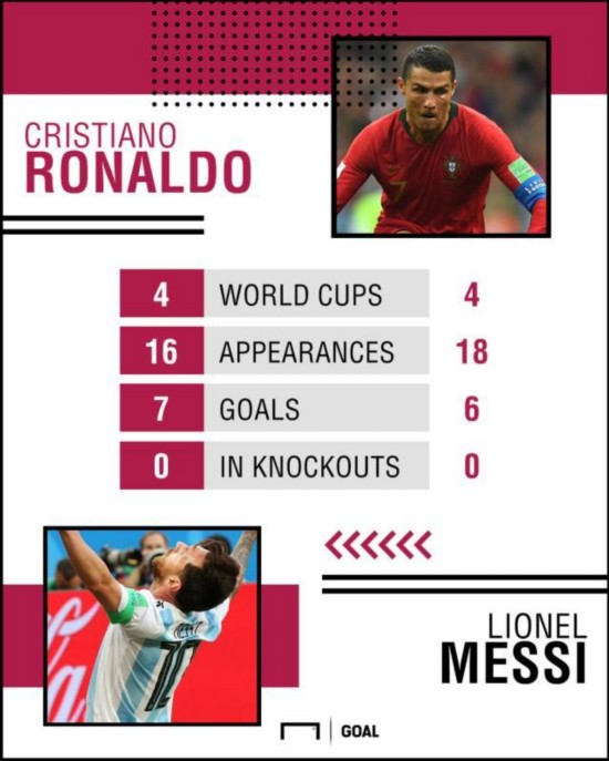梅西与C罗 体坛+记者孔阳报道 毫无疑问,当今足球世界最耀眼的两大明星非C罗与梅西莫属。在过去的10年之中,世界足坛由他们二人统治。其中,C罗率领皇马拿到了4座欧冠奖杯,而梅西则是带领巴萨缔造了无数荣誉。在个人奖项方面,梅罗二人也是分别5次拿到金球奖。 或许是在俱乐部层面的发挥太过于耀眼,在国家队比赛当中他们的表现并不算那么的完美。尤其是在世界杯的舞台上,C罗和梅西都已经4次参加这项足球盛事。只不过,他们二人在淘汰赛当中的进球数,现在都还依旧为零。 C罗成名于2004年的欧洲杯,2006年的德国之夏是他第一次随队参加世界杯。当时,葡萄牙队一路杀入到了四强当中。不过,C罗仅在小组赛和伊朗队的比赛之中射入一粒点球,淘汰赛并未进球入账。其后的2010年南非世界杯,C罗已经成为了葡萄牙队的头牌,也是世界上最出色的球员之一。只不过,那届世界杯C罗也只是在小组赛与朝鲜队的比赛之中有进球入账。2014年,已经三度成为世界足球先生的C罗再度启航。可在巴西,葡萄牙队在小组赛结束之后便打道回府,C罗甚至没有摸到淘汰赛的草皮。 根据统计,C罗目前已经在世界杯上踢了442分钟的淘汰赛。只可惜,在这段时间里面葡萄牙王牌一球未进,这或许也就是葡萄牙队一直无法在世界杯当中更进一步的最直接原因。 与C罗相比,梅西在世界杯的战绩或许要出色一点。2014年巴西世界杯,梅球王带领着蓝白军团一路杀入到了决赛,只是在加时赛当中惜败德国。不过,在梅西职业生涯至今参加的三届世界杯当中,他也没有在淘汰赛阶段有过进球纪录。 2006年时候,阿根廷队在四分之一决赛被德国队淘汰。梅西当时在球队当中还是小字辈,他在淘汰赛获得的出场机会并不多。2010年世界杯,阿根廷队又一次被德国队淘汰,可梅西还是没能在淘汰赛阶段进球。2014年世界杯,阿根廷队在淘汰赛之中连斩、瑞士、荷兰等球队。只不过,梅西依旧未能在淘汰赛之中入球。