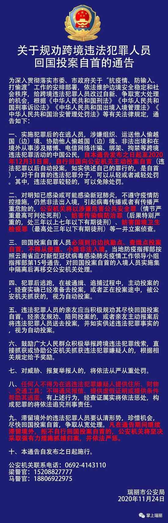 原标题:瑞丽警方规劝引导跨境违法犯罪人员回国投案自首140人 “掌上瑞丽”微信公号11月24日消息,瑞丽市在全面加强边境疫情防控措施的同时,广泛开展规劝跨境违法犯罪人员回国投案自首宣传工作。全市采用中缅双文双语制作相关宣传视频、音频、通告,充分利用官方微信、抖音、快手、网站等新媒体,结合乡村广播、流动小喇叭以及在边境线张贴通告、设立宣传栏等方式进行全方位宣传,确保该信息在边境一带家喻户晓。 瑞丽市公安局发布了《关于规劝跨境违法犯罪人员回国投案自首的通告》,市公安局指挥中心接到各类咨询投案自首的信息,接警人员积极引导在境外准备投案自首的人员到边境执勤点投案自首。 截至目前,瑞丽开展规劝跨境违法犯罪人员回国投案自首工作取得积极进展,通过各执勤点投案自首140人,所有回国投案自首人员经隔离留观后按规定进行相应处置。 瑞丽市公安机关再次呼吁滞留境外涉嫌各类违法犯罪的中国公民,尽早尽快回国投案自首。