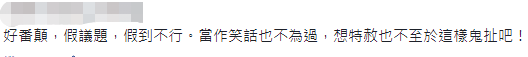 陈水扁的言论引起了台网民的“群嘲”,台网民指出,“真受不了这帮不愿面对现实的‘台独’”“假议题,假到不行,当做笑话也不为过,想特赦也不至于这样鬼扯吧”,还有网友指出,“(台湾)没有‘九二’共识根本就走不出去,还奢言举办什么世界杯,不知自己的分量”,最后,有台网友质问陈水扁,要申办的话用什么名字,“用中国台湾还是中华台北?”