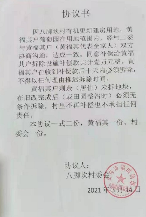 | 义乌这个村支书真霸道!非法强拆村民葡萄园,还打伤老妇 独立撰稿人 李海波 近日,浙江省义乌市福田街道八脚坎村民楼华萍向法讯君反映,她家种植多年的葡萄园被村支书黄守春带队强拆,还打伤了婆婆,报警后至今在医院医治,但派出所没有任何处理,村支书也没任何说法而逍遥法外,葡萄园也已被非法拆除…… ![]() 楼华萍家的葡萄园是2010年建成,有250株葡萄树和桃树、桑树、樱桃树及无花果树等30多株。 楼华萍说,村里搞旧村改造,因不满村里的政策,她多次找村里要说法,也申请自己在原址改建,但没得到同意。之后村里说要占用她家的葡萄园用作改造工人的工棚。楼华萍不同意,要求村里拿出征用手续。村里无法提供。 ![]() 直到4月28日上午村支书才拿来这张打印好的协议书,承诺补偿给黄福其1万元。而所属的楼华萍四人地块却不补偿,村里也不承担责任。黄福其全家还没有签字,村支书黄守春就在下午告之协议作废不补偿要强行拆除。 ![]() 4月29日上午,在没有任何手续的情况下,黄守春出动20多人,开着挖掘机对葡萄园进行强拆,婆婆许兰仙找他们说理,却被支书黄守春打倒在地!楼华萍报警后好长时间派出所才来了人,他们只是看了一下现场,没有对强拆人员及打人的黄守春进行处理,只是将婆婆扶到警车里送到第四人民医院。之后就没人管了。 ![]() 黄守春公示和打人现场 ![]() 被黄守春打伤住院的66岁老妇许兰仙在医院病床。被打后导致其头晕且发高烧、全身疼痛。但第四人民医院不给办理住院。 而葡萄园被拆除后没人管伤者,倒是在第二天就将管材拉到了葡萄园堆放。葡萄园里有196株葡萄树和39多株其他果树全被毁掉,葡萄园里有70多公斤塑料薄膜和桌子、马桶也被毁掉了。 而被打伤的许兰仙老太太如今还在东方医院住院治疗,没人理他们。他们希望义乌市政法机关严惩非法强拆和打人的黄守春等人,给受害人一个说法! |