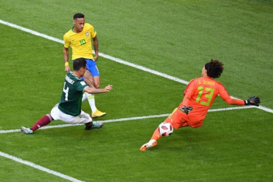 奥乔亚本场表现已经足够出色 墨西哥对阵巴西,尽管最终以0-2输掉了比赛,但他们的守门员奥乔亚仍然可以昂首离开世界杯赛场。 本场比赛,奥乔亚从比赛第5分钟开始就显示了自己的身手。当时,保利尼奥前场中路断球后起脚远射,奥乔亚奋力将球扑出。第25分钟,内马尔禁区左侧晃倒阿亚拉和拉云后小角度射门,奥乔亚又用肘部将球挡出。随后,热苏斯的连续两脚射门,都被奥乔亚一一挡出。