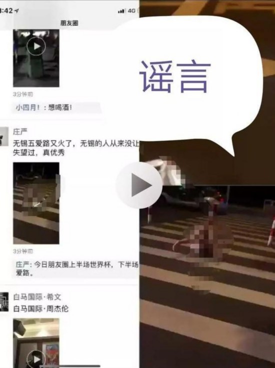 【传闻】6月16日,无锡当地微信群、朋友圈流传出一段街头“裸体女子夜晚在大街上做出不雅动作”的视频,有网民猜测是“因为世界杯喝多了”。