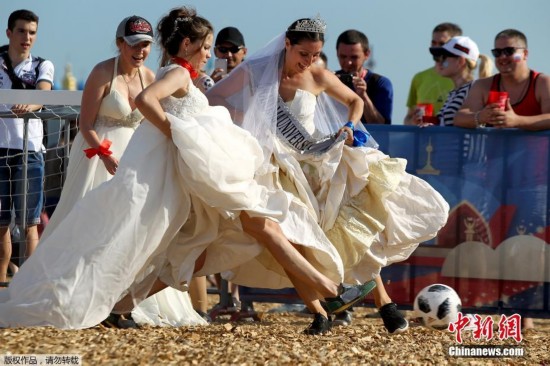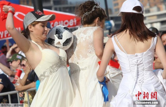 当地时间6月30日,2018年世界杯举办地俄罗斯地喀山举行的国际足联球迷大会上,身着婚纱的女士们参加了这场所谓的“新娘比赛”。